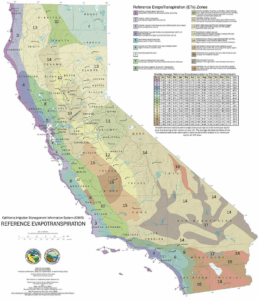 Each type of plant needs a certain amount of water to produce a crop, and more water is need in the summer months. The California Irrigation Management Information System (CIMIS) has published a map showing different geographic zones and a table of monthly averages. The amount of water that evaporates into the atmosphere and transpires (given off as water vapor) through a plant are combined to form evapotranspiration (ET). Because crops have different requirements, individual crop evapotranspiration (ETc) numbers have been determined by CIMIS. Tree fruit and nuts, for example, might need 7 inches of water in the hottest months while vines need 6 inches. For comparison, the reference ET number (ETo) is based on grass or alfalfa. A good irrigation design takes into account crop type and location in order to meet seasonal demand.